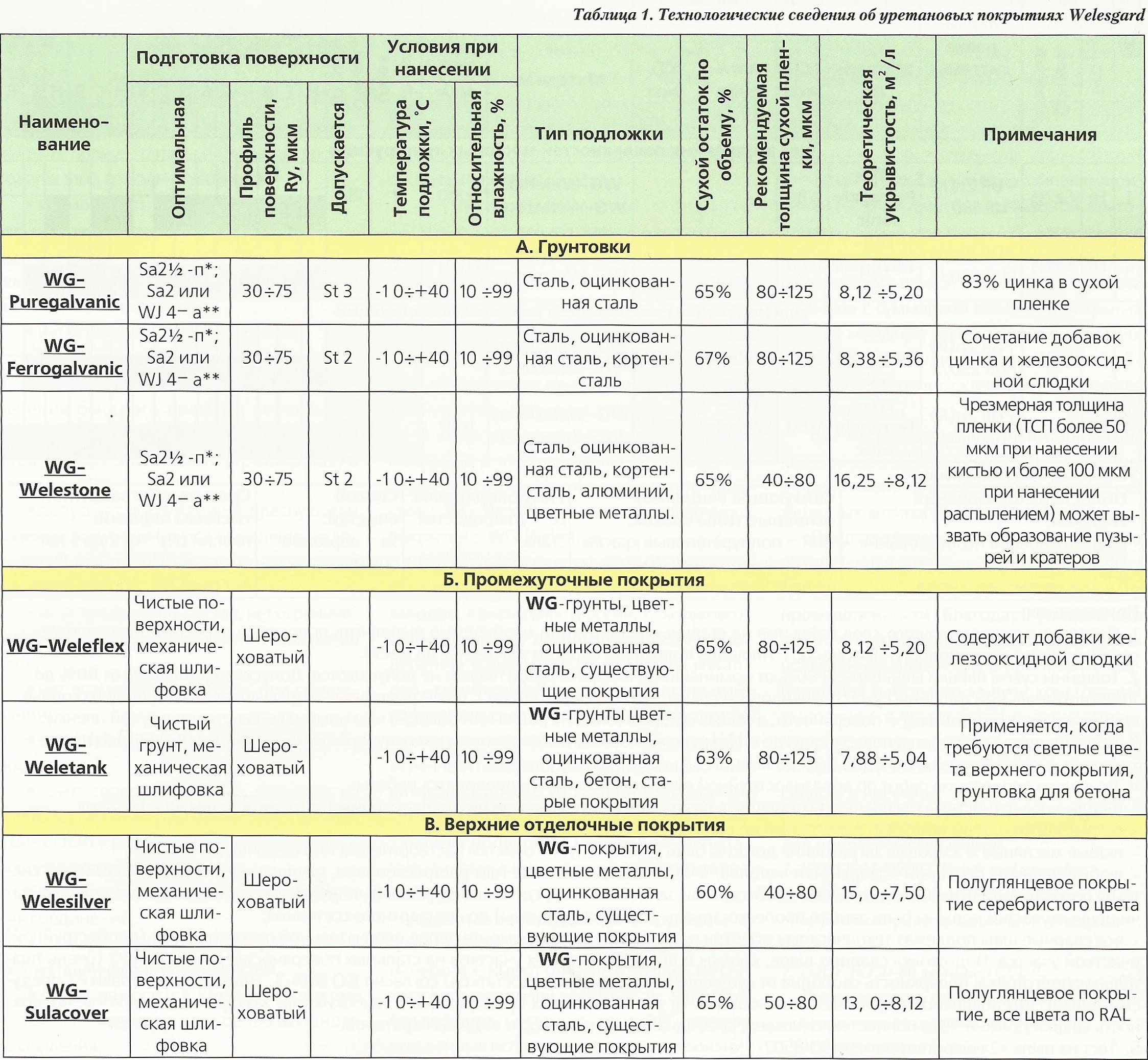 Продуктовая линейка Welesgard имеет диапазон грунтующих покрытий (ТУ У 24.3-36676447-001:2009), успешно применяемых как при новом строительстве, так и на старых сильно корродированных поверхностях, допускающих не очень тщательную подготовку поверхности. Например, WG-Puregalvanic - это антикоррозийная однокомпонентная полиуретановая, наполненная цинком грунтовка на основе растворителя с содержанием цинка в сухой пленке 83% по весу. Она твердеет при соединении с атмосферной влагой и используется в качестве грунтовки в многослойной системе покрытий для продолжительной защиты новых или ремонтируемых стальных конструкций, подверженных влиянию высокоагрессивных коррозионных сред и обеспечивает максимальное сопротивление распространению подслойной коррозии на различных стальных поверхностях. Этот материал не предъявляет высоких требовании к подготовке поверхности и может наноситься механическим способом на поверхность, обработанную сухой или влажной абразивоструйной, либо гидроструйной очисткой.