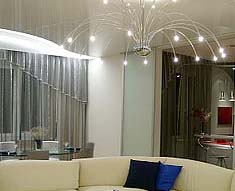 Также нежелательно использовать натяжные системы в помещении, где может потребоваться доступ к межпотолочному пространству. В таких местах гораздо удобнее установить подвесные конструкции, которые легко разбираются. В целом, если натяжные потолки больше подходят для отделки жилых помещений, то подвесные более целесообразно использовать для решения больших пространств различных общественных зданий, офисов. Если сравнивать обе технологии по уровню цен, то мы увидим, что натяжные системы - более дорогой вариант. Хотя некоторые виды подвесных конструкций, например реечные, вполне сопоставимы с ними в этом отношении. По богатству дизайнерских решений, конечно же, выигрывают натяжные потолки. На сегодня существует не только множество расцветок, но и различные фактурные решения - глянцевые, матовые, «сатиновые», «мраморные», «металлик», полупрозрачная потолочная ткань (позволяет расположить систему освещения над полотном, что создает эффект светящегося потолка). При этом можно создавать ровные и ассиметричные плоскости, переходы уровней, арки, волны и изгибы, купольные и шатровые формы.