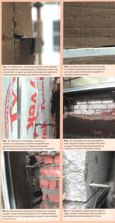 Проблемы утепления навесных фасадов с воздушным зазоромВ предлагаемой статье рассматриваются проблемы и ошибки утепления в навесных фасадах с воздушным зазором, связанные с невниманием к самой технологии утепления. Статья подготовлена ведущими специалистами государственного центра «Энлаком» Процесс утепления начинается с проекта фасадной конструкции, в котором уже могут быть созданы предпосылки для некачественного проведения теплоизоляционных работ, заложены проблемы теплофизического свойства, влияющие в конечном итоге на теплозащитные свойства ограждения и на его долговечность. Так, например, если в проекте изначально допускается возможность расположения несущих металлических элементов каркаса (вертикальные и горизонтальные направляющие) навесной фасадной системы в слое утеплителя (рис. 1, 2), то тем самым одновременно допускается понижение коэффициента теплотехнической однородности утепляющего слоя на 10%. Кроме того, такое расположение направляющих создает условия для более интенсивного развития процессов коррозии в металлических элементах каркаса, по причине затрудненного воздухообмена и, следовательно, менее интенсивного влагоудаления из таких мест фасадной системы. Такие дефекты в системах утепления, как расположение направляющих каркаса в слое утеплителя, могут возникнуть и при соблюдении всех норм проектирования, эпизодически проявляясь в отдельных местах фасада. Это происходит либо из-за локальных искривлений стены-основания, либо из-за непараллельности плоскостей возводимого навесного фасада и стены-основания. Утеплитель при этом выпирает на отдельных участках стены и занимает положение вровень с наружной гранью направляющих, иногда выходя за эти грани (рис. 3). В таких случаях требуется срочное вмешательство проектировщиков и принятие решений по внесению изменений в проектную документацию (поскольку нельзя допускать ситуации, когда перекрывается воздушный вентилируемый зазор). Все чаще оконные заполнения (или витражи) в соответствии с проектом выдвигаются из плоскости стены-основания наружу. Используемые при этом опорные консоли способствуют возникновению мощных мостиков холода. Нейтрализовать их негативное воздействие на конструкцию, в теплофизическом смысле, не удаётся затем уже ни при каких мерах (рис. 4). Выдвинутый наружу по отношению к стене-основанию витраж создает существенные трудности по герметизации монтажного узла «сопряжения» оконного заполнения и утеплителя, т.к. практически невозможно ликвидировать зазоры между стойкой витражной конструкции и слоем минераловатного утеплителя (рис. 5). Или другой пример (рис. 6): непродуманность конструктивного решения стенового заполнения в надоконной зоне -металлическая балка и три ряда кирпича сверху - (окно в плане этажа г-образное) не создает жёсткого основания для крепления несущих кронштейнов и утеплителя. Из-за нависающих над металлической балкой рядов кирпича невозможно в дальнейшем качественно выполнить монтажный стык оконного блока и утеплителя. В данном случае целесообразно было бы решить надоконную часть стены-основания в железобетоне. В общем случае, для выполнения качественного утепления в системах навесных фасадов необходимо руководствоваться следующими принципами.