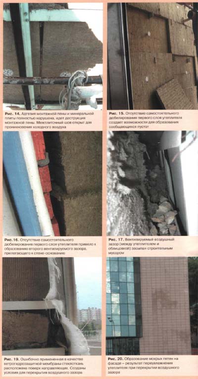 Перекрытие воздушного зазора приводит к ухудшению влажностного режима ограждения, к повышению влажности утеплителя и снижению теплозащитных качеств стеновой конструкции. При определённых условиях последствия от перекрытия воздушного зазора могут проявиться и на лицевой части фасада -в виде мокрых пятен (рис. 20), а в некоторых случаях привести к появлению трещин на элементах облицовки (результат весьма вероятных процессов льдообразования в переувлажнённом слое утеплителя). В современных зданиях, в которых разделяются несущие и утепляющие слои в ограждающих конструкциях, необходимо уделять пристальное внимание устройству теплоизоляционного слоя. От его качества напрямую зависит безопасность жильцов в зимний период.