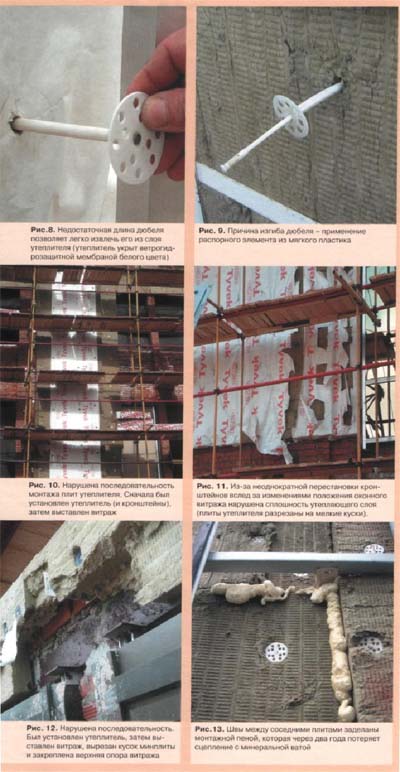 ![]() На практике прижать утеплитель вплотную к стене-основанию не всегда удаётся не только из-за ее локальных искривлений. Причиной тому может быть также непригодность стены-основания для удержания дюбелей определённого типа, неправильный выбор длины дюбелей, применение несертифицированных дюбелей (рис. 7. 8). Эти и другие нарушения технологии теплоизоляционных работ приводят к понижению качества системы утепления в целом. Непригодность стены-основания выражается в применении непрочных материалов (низкоплотных или пустотных кладочных элементов) в сочетании с дюбелями, имеющими укороченную распорную часть, либо с дюбелями не того принципа работы (необходимы химические, а применяют обычные, распорного типа). Часто ошибки в выборе длины дюбелей, связаны с недоучетом реальной кривизны стены-основания, что вызывает неплотное прилегание утеплителя и увеличение толщины дюбелируемой зоны. Простые расчёты показывают: при толщине утеплителя в 150 мм и длине анкеруемой (в бетон) части дюбеля в 50 мм нужно иметь для производства работ крепежные элементы длиной от 200 до 250 мм. Не следует полагать, что лишь при использовании пеноблоков (рис. 7) возможно применение дюбелей без распираемой (анкеруемой) части. Легко можно произвести крепление утеплителя одними стержнями и в высокопрочном бетоне, заанкерив распорные стержни в тело бетона на 1-2 см, предварительно укоротив их на 3-4 см. Это, безусловно, нарушение технологии производства работ, но в принципе такой укороченный дюбель трудноизвлекаем (если его удалось забить в бетон). Тут необходимо подчеркнуть, что дюбели в навесных системах при креплении утеплителя не испытывают выдергивающих усилий от внешних воздействий в процессе эксплуатации. Они могут быть извлечены только под воздействием силы упругого сжатия утеплителя. Несертифицированные дюбели не предназначены для применения в наружных работах. Чаще всего они изготовлены из неморозостойких материалов, что влечёт разрушение или отрыв шляпки (рандели), или из материалов с неизвестными реологическими свойствами, что приводит к релаксации напряжений в распираемой части и, следовательно, к возможной подвижности относительно стены-основания. Причиной изгиба дюбеля (рис. 9) чаще всего является применение распорного стержня из мягкого пластика, что вызывает в дальнейшем сползание утеплителя. Следующая важная проблема - это взаимная увязка двух технологических процессов - установки оконных конструкций и начала монтажа утеплителя и кронштейнов НФС. Как это ни парадоксально звучит, но окна проще устанавливать после того, как часть навесной фасадной системы уже смонтирована. При такой последовательности работ проще определиться с высотным расположением оконного блока, ибо модульный размер наружной облицовки диктует то превышение, на которое надо поднять оконный блок для обеспечения стока воды по подоконному отливу. Кроме того, при известном расположении плоскости фасада можно с первого захода выровнять оконные блоки и в плане. Отсюда напрашивается вывод, что эти два вида работ должны выполняться параллельно, в тесном взаимодействии фасадной и оконной фирм, либо надо сосредоточить оба технологических процесса в «одних руках». Последствия невнимания к данной проблеме рассмотрены на рисунках 10, 11, 12. Причем очень часто в результате 