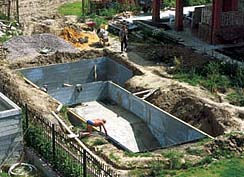 Бетон заливают в подготовленный котлован с фундаментом и арматурой - это стены и дно бассейна. Важно, чтобы чаша заливалась сразу, а не частями. Бассейн, сделанный из нескольких слоев, очень ненадежен. Перед застыванием бетона необходимо «выбить» из него воздушные пузырьки. Это делается с помощью специальных вибрирующих молоточков. Сохнуть чаша должна месяц, лишь изредка ее нужно поливать водичкой, чтобы не было рассохшихся трещин. Поверхность должна получиться ровной, без заметных впадин и бугров. Но можно поступить проще. Некоторые фирмы, по желанию заказчика, используют кессоны - металлические пластины - для формирования опалубки чаши: одна пластина примыкает непосредственно к грунту, вторая служит внутренней стенкой чаши. В пространство между двумя пластинами заливают бетон - для прочности конструкции. Этот способ, конечно, дешевле, но такая чаша будет со швами. Швы, правда, потом герметизируют и сваривают, но это определенный риск: проблемы с герметизацией могут обнаружиться в самый неподходящий момент. Специалисты утверждают, что лучше и надежнее монолитной бетонной чаши пока еще ничего не придумано. Кроме того, важно соблюсти безопасное расстояние от помещения с бассейном до щитков электропроводки. Для пущей безопасности можно отделать стены помещения облицовочными материалами, не впитывающими влагу и не пропускающими сырость: плиткой, пленкой ПВХ или стеклянной мозаикой. Покрытия стационарного бассейна Итак, чаша выровнена, теперь ее надо оштукатурить. Штукатурка не всегда хорошо сцепляется с поверхностью, со временем может отслоиться. Этого не произойдет, если использовать водостойкие ремонтные составы. Например, итальянские «Резисто Унификс», «Резисто Тиксо» или штукатурный раствор с латексными добавками «Колласил» и «Латифлекс», повышающими водостойкость и эластичность штукатурки.