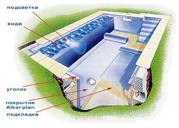 Цена квадратного метра пленки - от $10 до $40 без укладки. На нашем рынке пленку ПВХ предлагают компании «Маркопул», «Папилонс», «Аквалэнд», «Алькорплан», «Конрэйз». Как ее укладывать? Поверхности стен должны быть тщательно отшлифованы, иначе пленка может протереться. При реконструкции старых бассейнов или бассейнов, отделанных плиткой, в которых возникли проблемы с гидроизоляцией, возможна укладка пленки непосредственно на плитку. Но, правда, надо быть уверенным, что плитка не отслоится. Сначала закладывают так называемую крепежную полосу: металлическую ленту длиной 2 м, шириной 5-6 см, толщиной 2 мм. На нее с одной стороны наносится пластиковое покрытие, к нему приваривается пленка. Крепежная полоса прикрепляется к поверхности бассейна шурупами. Если дно бассейна имеет сложную форму (крутые уклоны, многоуровневую структуру), необходимо производить крепление и на дне, чтобы избежать подвижности донных листов пленки. Ведь она не приклеивается к поверхности, а просто обтягивает бассейн изнутри и плотно прижимается водой. Под пленкой прокладывают геотекстиль - нетканое полимерное полотно толщиной от 0,5 до 1 см, похожее на войлок. Оно предохраняет пленку от повреждения и конденсата. Края пленки сваривают горячим воздухом, потом для максимальной герметизации затирают жидким пластиком. ![]() Вариант облицовки внутренней части стационарных бассейнов с помощью материала Alkorplan (одновременно он является и гидроизолятором). Укладка (работа, пленка, геотекстиль) обойдется в $45-50 за квадратный метр. Плюсы