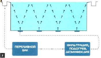 Схема с переливным бортом подходит для резервуаров любого объема и геометрической формы. В отличие от скиммерного бассейна зеркало воды здесь расположено вровень с кромкой. Для лучшей очистки желоб рекомендуют протягивать по всему периметру. Попадающая туда вода уходит в накопительный бак, и уже оттуда ее забирает насос фильтровальной установки. После фильтрации, подогрева и дезинфекции вода поступает в бассейн через равномерно расположенные донные форсунки. Для равномерного прохождения потока скорость прохождения воды через все подающие отверстия должна быть одинаковой. Этого достигают унификацией сечений подающих трубопроводов и расположением их в одной горизонтальной плоскости.