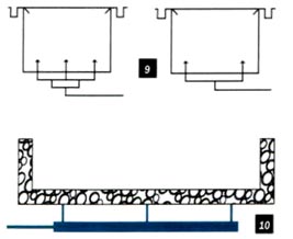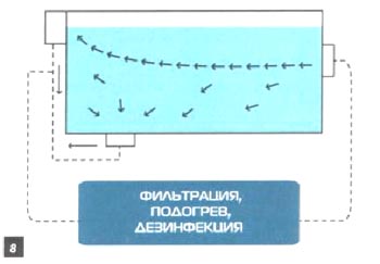 Кроме фильтров и химических препаратов для поддержания чистоты бассейна необходима правильная циркуляция воды, обеспечивающая постоянное удаление грязной жидкости через переливной желоб (скиммер) и поступление чистой через подающие форсунки. Этот процесс предусматривает два способа циркуляции - на основе вытеснения (рис. 7) и на основе перемешивания (рис. 8).
