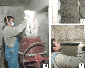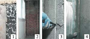 Начиная работу с незнакомым материалом, мы постарались обезопасить себя от возможных проблем и, несмотря на то, что в руководстве по применению «Родипора» отсутствует упоминание о необходимости применения грунтовок, провели серию экспериментов с использованием различных грунтовочных составов, в том числе и «Бетонконтакта». Ни в одном случае не отмечено существенного улучшения адгезии, а вполне удовлетворительный результат был достигнут после тщательного обеспыливания и легкого увлажнения основания (бетон и кирпичная кладка). Внимание: чрезмерное увлажнение приводит к обратному результату: сцепление раствора с основанием резко уменьшается, что приводит к оползанию нанесенного слоя.