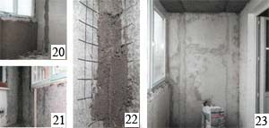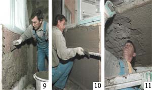 Пришлось выполнять работу в два этапа: сначала набрасывали слой толщиной около 30 мм (фото 7), а на следующий день наносили оставшийся материал и выравнивали поверхность по направляющим (фото 8). Таким образом были утеплены стены первого балкона, причем полученный результат (фото 23) устраивал не только исполнителей, но и заказчика, который до этого момента не очень верил в чудесные свойства «Родипора». После высыхания штукатурки разница температур в квартире и на балконе, ранее весьма заметная, при постоянно открытой балконной двери практически не ощущается (на момент написания статьи температура наружного воздуха не опускалась ниже нуля).