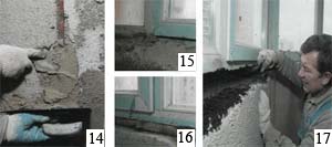 Пазы, образующиеся после удаления направляющих, на всю глубину заполняют (снизу вверх) раствором «Родипора» (фото 14). От качества выполнения этой несложной, но ответственной операции зависит работа системы утепления в целом. Формальный подход, заключающийся в чисто косметическом замазывании швов на небольшую глубину, скорее всего, приведет к промерзанию швов с последующим образованием узких полос конденсата, а потом и плесени.