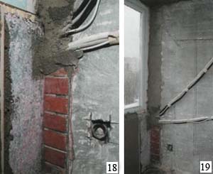 В нашем случае одной из таких «спорных территорий» являлось место примыкания к балконному окну теплой, казалось бы, стены, грани чащей с кухней. В действительности кирпичная облицовка, заведенная внутрь балкона (фото 18), ничем не защищена от потерь тепла (читай -промерзания). Бетонная плита, отделяющая балкон от кухни, имеет (во всяком случае, должна иметь) внутренний теплоизоляционный сердечник (пенополистирол), который защищает от потерь тепла кухню, но не балкон. В отсутствие подробных чертежей ограждающих конструкций расчет утепления таких спорных зон является трудноразрешимой задачей, поэтому, не вдаваясь в подробности, скажем, что в данном случае зона примыкания к оконному проему подлежала утеплению на ширине не менее одного метра, при толщине теплоизоляционной штукатурки (возле окна) не менее 50 мм.