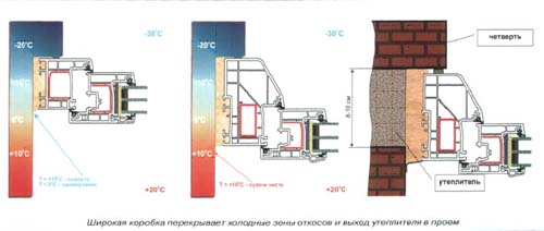 Практически точка росы зависит только от концентрации водяного пара в воздухе. Чем она ниже, тем ниже точка росы, и наоборот. При концентрации 8 г/м3 точка росы находится на уровне +7,7°С. Эта концентрация соответствует оптимальному микроклимату, т.е. относительной влажности 45% при температуре +20°С. В домах европейцев оптимальная влажность поддерживается системами вентиляции, которые обеспечивают как вытяжку, так и приток воздуха автономно от окон. В наших домах традиционно проектируется только вытяжная вентиляция, а приток воздуха предполагается через окна. Но высокая герметичность пластиковых окон блокирует воздухообмен, и в квартире копится влага. Увеличение концентрации водяного пара всего на 1 г/м3 от в.у. значения поднимает точку росы до 9,5°С, а на 2 грамма уже до 11°С. И это мизер, соответствующий испарению всего полутора стаканов воды в средней квартире. На пределе допустимых для микроклимата температуры +24°С и относительной влажности 60% точка росы составит почти +16°С! В условиях российских морозов холод проникает в толщу стены и монтажный шов гораздо глубже, чем в теплом климате европейской зимы. И если ТАМ глубина монтажного шва в 6 см вполне достаточна, чтобы надежно защитить откосы и не допустить их охлаждения ниже +15°С, то ЗДЕСЬ, при -20-30°С наши откосы не будут гарантированно изолированы от температур ниже точки росы и при глубине монтажного шва 7 см. Кроме того, комнатный воздух может проникнуть через поры в монтажной пене вглубь шва, если он не имеет пароизоляции, а также внутрь утеплительного слоя стены, если его выход в откос не заделан строителями как положено. Неминуемо конденсируясь там, влага вызовет отсыревание стены и монтажного шва изнутри. Учитывая, что такие морозы хотя бы один раз за зиму случаются практически во всей средней полосе России, а минувшей зимой не обошли даже Краснодарский край, становится ясно, что гарантировать климатический комфорт россиянину может только широкая коробка с более радикальной монтажной глубиной и устройство, улучшающее воздухообмен. На сегодня в России есть только одна оконная система, которая удовлетворяет сразу обоим требованиям -EXPROF AeroTherma с коробкой 101 мм и внутрипрофильной приточной вентиляцией. Она производится с 2002 года и уже почти пять зим успешно эксплуатируется повсюду от Заполярья до Черноморского побережья, удивительным образом превращая даже очень сырые квартиры в комфортное жилье со здоровым микроклиматом. Секрет успеха AeroTherma в том, что она решает проблему откосов и конденсата комплексно. С одной стороны, несмотря на возможные дефекты проема и четвертей десятисантиметровый оконный блок обеспечивает глубокий монтажный шов, надежно изолирующий от холода зону примыкания. При недостаточной пароизоляции комнатному воздуху значительно труднее достигнуть в толще такого шва изотермы точки росы. Благодаря своей толщине блок AeroTherma с запасом перекрывает зоны откоса с опасно низкой температурой. При наличии в стене утеплительного слоя широкая коробка полностью перекрывает и его, препятствуя проникновению туда комнатного воздуха. Выступающий носик оконной коробки сдвигает плоскость стеклопакета вглубь оконного проема навстречу теплому воздуху помещения, повышая температуру внутреннего стекла. ![]() С другой стороны, система приточной вентиляции способству