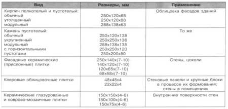 Керамические изделия для облицовки выпускаются глазурованными и неглазурованными (табл. 1). К ним относятся лицевой кирпич полнотелый и пустотелый, фасадные керамические (прислонные) и ковровые облицовочные плитки. Кирпич и камни лицевые керамические имеют марки по прочности 75, 100, 125, 150; водопоглощение 6-14%. Керамические изделия для облицовки Лицевой керамический кирпич Лицевой керамический кирпич - строительное изделие, которое выполняет одновременно конструктивные и декоративные функции. По виду фактуры (отделки) лицевой поверхности выпускают керамические кирпичи и камни торкретированные минеральной крошкой, ангобированные, с окрашенным черепком, двухслойного формования и глазурованные. Офактуренными должны быть один ложок и один тычок. Фактура может быть гладкой или рельефной. Торкретированный кирпич изготовляют из легкоплавких глин. Фактуру лицевой поверхности у такого кирпича получают нанесением на ложковую и тычковую поверхности бруса стеклокрошки, песка, фарфора, шамота, артикского туфа. Ангобированный кирпич получают нанесением декоративного керамического покрытия толщиной 0,2-0,3 мм (ангоба). Сырьевыми материалами для ангобов служат беложгущиеся глины (80-90%) и стеклобой (10-20%). Возможно также использование каолина, кварцевого песка и мела. Для получения цветного покрытия в состав ангоба вводят 5-7% минеральных красителей. Ангобы наносят на отформованные изделия в виде керамической суспензии-шликера средней плотностью 1300 кг/м3. Глазурованный кирпич получают нанесением глазурного покрытия на обожженный кирпич методом двухкратного обжига. Кирпич после первого обжига зачищают карборундовым камнем или шлифуют, удаляют с поверхности пыль, увлажняют и пульверизатором наносят глазурное покрытие. После сушки глазурного покрытия кирпич подвергают повторному кратковременному обжигу. В современном строительстве лицевой кирпич используют также для отделки внутренних стен вестибюлей, лестничных клеток, переходов, интерьеров и отдельных архитектурных элементов зданий. Для кирпичных зданий он является наиболее экономичным видом облицовки фасадов. Применение лицевого кирпича по сравнению с мокрой штукатуркой снижает стоимость 1 м2 стены на 15%, уменьшает трудовые затраты на 25% и сводит до минимума эксплуатационные затраты на содержание фасадов домов. Плитки керамические Керамические плитки применяют в строительстве как отделочный материал, обладающий высокой архитектурной выразительностью в сочетании с хорошими физико-механическими свойствами, недефицитностью исходного сырья и сравнительно невысокой стоимостью. Новая технология изготовления керамических плиток позволила им занять ведущее положение в широкой гамме строительных отделочных материалов. Керамические плитки в основном производят трех видов: для внутренней облицовки стен, полов, фасадов. В зависимости от области применения к плиткам предъявляют различные требования по физико-механическим свойствам и внешнему виду. Плитки керамические для облицовки фасадов зданий применяют для облицовки наружных стен кирпичных зданий, наружных поверхностей железобетонных стеновых панелей, цоколей зданий, подземных переходов, эркеров, фризов, обрамления оконных и дверных проемов и оформления других архитектурных элементов зданий. Плитки изготовляют м