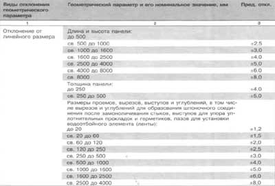 Значения действительных отклонений геометрических параметров панелей не должны превышать предельных, указанных в табл. 5.