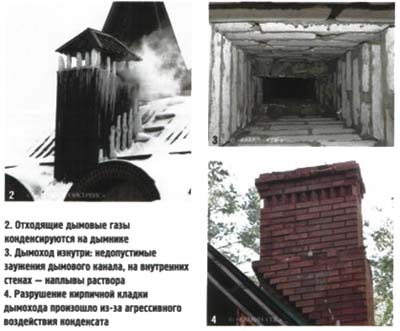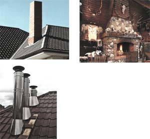 При сооружении дымохода особое внимание следует уделить местам его прохождения через межэтажное перекрытие и крышу. У коренных и насадных труб для обеспечения огнезащиты перекрытия делают распушку. Это горизонтальная кирпичная разделка, выполняемая в зонах пересечения дымовых каналов и межэтажных и чердачных перекрытий. В пределах разделки толщина стенок трубы увеличивается до одного кирпича, то есть до 250 мм. При устройстве распушки нельзя допускать, чтобы кирпич кладки разделки опирался на настил деревянного перекрытия или балки. Это небезопасно с точки зрения возникновения пожара, поскольку во время осадки деревянной конструкции может образоваться трещина. Все горючие элементы (например, деревянные перекрытия, балки) должны располагаться на расстоянии не менее 250 мм от внутренней стенки дымохода, поэтому между трубой и деревянным перекрытием следует предусмотреть зазор. Его заполняют теплоизолирующими негорючими материалами, а вокруг трубы укладывают лист кровельной стали размером чуть больше проёма. Для этой цели можно использовать продающиеся в строительных магазинах специальные металлические насадки, которые фиксируют трубу в больших отверстиях потолка и кровли. Место прохода дымовой трубы через крышу также должно быть выполнено с учётом противопожарных требований и защищено от возможных протечек. Для обеспечения огнезащиты перекрытия и кровли устраивают преграду (аналогичную той, что при прохождении межэтажного перекрытия), а для заделки кровельного ковра — напуск («выдру»). Она нависает над кровлей на 100 мм по всем четырём сторонам и защищает место примыкания ковра к трубе. Выше «выдры» расположена шейка трубы, выложенная вполкирпича, а затем за счёт расширения кладки образуется оголовок. ![]() Впрочем, иногда обходятся без «выдры» и решают проблему гидроизоляции по-иному. Из кровельного железа на трубу изготавливают металлический кожух, соединённый (при помощи герметика) с листом железа, укладываемого на крышу, — так добиваются надёжной гидроизоляции. Кожух красят в цвет уже имеющегося покрытия для создания общего дизайна. Отверстие трубы должно быть защищено от осадков, поэтому оголовок снабжают дымником, выполненным чаще всего из металла. Устройство дефлекторов на дымовых трубах не рекомендуется. Все участки кирпичного дымохода, непосредственно контактирующие с внешней средой, обязательно утепляют, с этой целью трубы снаружи штукатурят или закрывают железобетонными, шлакобетонными плитами, щитами. Классика и современность И всё же, как ни утепляй кирпичный дымоход снаружи, это не спасёт его от конденсата, а следовательно, и от разрушения, особенно если он обслуживает современный котёл с низкой температурой отходящих газов. Чтобы избежать негативных явлений и существенно продлить срок службы дымохода, необходимо изолировать кирпичную кладку от газовых потоков. Сделать это можно с помощью установленных внутри дымового канала труб из жаростойкой кислотоупорной стали (00Х17Н14М2). В таком случае дымоход станет просто «коробом», а в контакте с выхлопом будет находиться лишь стальная труба. Производители предлагают широкий ассортимент труб разного диаметра (от 1 00 до 300 мм), гибких сегментов, колен (от 0 до 90°), тройников, поворотников, муфт-переходников и других деталей для «модернизации» кирпич