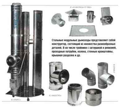 Виды дымоходов Все типы дымоходов можно условно разделить на две группы: кирпичные и модульные. В свою очередь, модульные делятся на стальные, керамические, полимерные. Кирпичные дымоходы являются традиционными. Они великолепно сочетаются с архитектурным обликом любого дома, особенно выполненного в стиле кантри. Облицованная натуральным или искусственным камнем печная труба будет хорошо смотреться как на крыше сруба, так и на кровле здания в духе старинного замка. И хотя при сжигании твёрдого топлива (дровами топят камины и банные печи, углём — некоторые котлы) кирпичные дымоходы по-прежнему остаются востребованными, всё же сегодня они отходят на второй план, уступая место модульным конструкциям. А причина этого - переход котлов с твёрдого топлива на газ и жидкое топливо. До использования в отопительных агрегатах газа и жидкого топлива кирпичный дымоход прекрасно справлялся с поставленной задачей. Но в современных отопительных системах температура отходящих газов существенно снизилась, и в таких условиях (по причине высокой теплоёмкости кирпича) кирпичный дымоход не может быстро прогреваться. В момент запуска системы отопления это приводит к появлению в трубе большого количества конденсата, который, собираясь на стенках дымовых каналов и смешиваясь с продуктами горения природного газа, образует жидкость с кислотными свойствами, разрушающую кирпич.