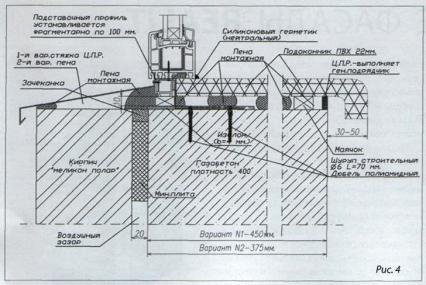 Рассматривая узлы примыкания к означенным стеновым проемам, необходимо также заметить, что наиболее проблематичен для оконщиков зазор между кирпичной кладкой и газобетоном. Как бы хорошо ни выполнялся стык, воздухопроницаемость неоштукатуренной кирпичной кладки высока, и инфильтрация холодного воздуха в монтажный шов окна в зимний период может привести к промерзанию рамы. Чтобы этого избежать, существует несколько способов. Воздушный зазор может заполняться различными типами утеплителей (минераловатные плиты, материалы на основе вспененного полиэтилена и т. д.), но глубина заполнения воздушного зазора утепляющими материалами определяется при выполнении теплотехнических расчетов. НИУПЦ "Межрегиональный институт окна" рекомендует установку полотнищ мембранного типа, например, Illbruck illdif А или их аналогов, принятых при ветрозащите в конструкциях кровли (Tyvek и т. п.), см. рис. 3. При использовании наружного штукатурного покрытия цементно-песочным раствором (Rjnt = 373 (м2-ч-Па)/кг) толщиной 15 мм необходимость в такой мембране отпадает. Увеличение затрат происходит главным образом за счет дополнительного вида работ, стоимость монтажных материалов остается без изменений, а постгарантийные затраты минимизируются.