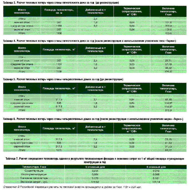 Ниже приводится расчет тепловых потерь через стены домов. В таблице 7 приводится расчет сокращения тепловых потерь жилых домов в результате теплоизоляции фасадов утеплителем марки "Термо" толщиной 100 мм, а также экономии затрат в результате снижения расхода тепла на 1 кв. м ограждающих конструкций, исходя из средней стоимости 1 Гкал для населения в г. Москве и Московской области в размере 1046,00 руб. по состоянию на январь 2008 года. Исходя из полученных результатов, можно сказать, что при использовании для реконструкции зданий утеплителя марки "Термо", экономия затрат на отопление одного квадратного метра ограждающих конструкций составляет примерно 185,00 рублей в год. При средней площади ограждающих конструкций одного жилого дома, взятой за 12000 кв. м, экономия затрат на отопление в 2008 г. составит 2220 тыс. рублей в год.