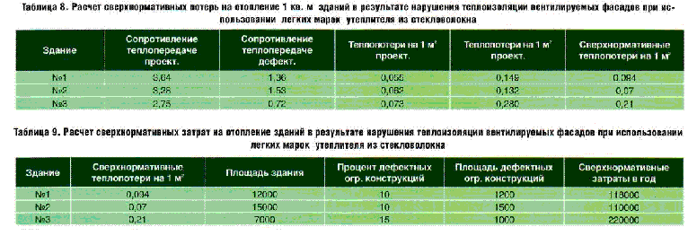 Одним из наиболее часто обсуждаемых вопросов являются критерии выбора утеплителей для навесных вентилируемых фасадов (далее НВФ). В практике применения НВФ часто встречается неграмотный или осознанный (с целью экономии) выбор "легких" марок утеплителей, заведомо обречённых на разрушение и короткий срок службы. Надо понимать, что правильность этого выбора состоит не только в желании "сэкономить", но и в том, что каждый материал имеет свою область применения."Легкий" материал, используемый для утепления будки любимой собаки, не может применяться при утеплении фасада современного высотного здания. Крепление материала, плотность которого ниже общепринятых норм плотности в 80 кг/м для НВФ, приведёт к его неминуемому сползанию и разрушению. Хотелось бы так же отметить, что в последнее время широкое распространение получило двухслойное решение теплоизоляционного слоя, когда на внутренний слой применяются материалы меньшей плотности при более плотном верхнем слое. Такая конструкция имеет неоспоримое достоинство с точки зрения снижения затрат, но должна применяться в рамках разумности. На деле же получается, что на внутренний слой используется стекловолокно плотностью 15-20 кг/м3, что с точки зрения законов физики просто абсурдно. Получается, что внутренний легкий слой воспринимает и распределяет нагрузку от верхнего слоя, который в 7 раз тяжелее, что однозначно приведёт к очень скорому печальному финалу -сползанию и деформации! Ниже приведены термограммы конкретных зданий до и после ре конструкции, с использованием утеплителей различного типа. Практические расчеты полностью подтверждают выше приведенные выводы. В таблицах 8 и 9 приводится расчет сверхнормативных теплопотерь различных видов зданий при использовании легких марок утеплителей из стекловолокна в конструкциях вентилируемых фасадов. Сверхнормативные потери вызваны увлажнением утеплителя и, как следствие, его сползанием под собственным весом. Кроме того, замерзание влажного утеплителя приводит к его разрушению и разрушению наружной отделки здания. Следует отметить, что с каждым годом эксплуатации здания площадь ограждающих конструкций с дефектами теплоизоляции будет увеличиваться в арифметической прогрессии на 5-6%, а стоимость энергоресурсов ежегодно возрастает в среднем на 20%.