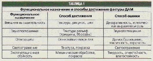 Разработка новых видов ДАМ потребовала создания художественных и технологических принципов обработки изделий, направленных на получение материалов, максимально сочетающих весь комплекс функциональных свойств (таблица 1). Внешняя выразительность ДАМ достигается рациональным сочетанием текстуры материала с дополнительными способами обработки поверхности. Текстура ДАМ неразрывно связана со структурой материала и, следовательно, повторяет её ячеистый, зернистый, волокнистый характер. Однако, как правило, самостоятельно текстура не обеспечивает требуемой выразительности из-за монотонности и мелкодисперсности её элементов. В этом случае целесообразно применить устройство рельефных элементов (например, элементов орнамента) или покраску поверхности одним цветом или сочетанием цветов. Фактуры с однотипным повторяющимся рисунком и цветом подчёркивают назначение помещения, фактуры, сочетающие в себе различные цветовые решения, наличие рисунков или орнаментов на разных уровнях (плитка, наборные элементы) позволяют создать ненавязчивый интерьер, располагающий к отдыху и длительному пребыванию. Общественные помещения, украшенные панно, витражами и другими декоратив ными элементами требуют, как правило, архитектурно нейтральной поверхности, образованной изделиями с маловыражен-ной фактурой (мелкий рельеф, хаотическая перфорация и т.д.) Внешняя выразительность фактуры, её декоративность и эстетические достоинства воспринимаются благодаря зрительному восприятию световых неравномерностей. Исходя из этого принципа, различают два вида фактуры: гладкая (от зеркально блестящей до шероховато ровной) и рельефная, отличающаяся по высоте и характеру рельефа. Немаловажную роль в создании фактур играет цвет красящего слоя. При разработке ДАМ было принято деление фактурных поверхностей по следующей схеме. Гладкая фактурная поверхность образуется, как правило, при шлифовке материала и характеризуется его текстурой. Из-за недостаточно высоких звукопоглощающих показателей материалов с гладкой поверхностью они подвергаются дополнительному офактуриванию: перфорации, нанесению трещин, борозд и рельефа. Сочетание отверстий, трещин, борозд различных размеров позволяет варьировать внешний вид изделий и их декоративность. При отделке ДАМ применяются главным образом круглая перфорация, реже, из-за значительного снижения прочности изделий, - щелевая.