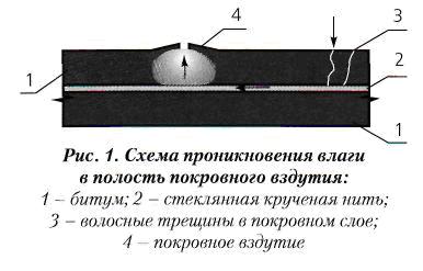 Повышение эффективности ремонта многослойных кровельПриведены результаты научных исследований в области повышения эффективности методов ремонта многослойных кровель, полученные в Ростовском государственном строительном университете и Ростовском НИИ коммунального хозяйства. Предотвращение повреждений многослойных кровель при их ремонте Экспериментально установлено, что воздухопроницаемость стяжки из капиллярно-пористых материалов, в зависимости от влажности, может изменяться более чем в 30 раз. Например, стяжка из цементного раствора при максимальном водонасыщении становится практически воздухонепроницаемой, выдерживая перепад давления по обе ее стороны в 2-3,5 кПа. Если на поверхности стяжки в полости подкровельного вздутия имеется тонкий слой воды (толщиной менее 1 мм) стяжка может обладать односторонней проницаемостью, так как любая капля воды, перекрывающая сверху капилляр в стяжке, в этом случае будет выполнять функцию обратного клапана. Происхождение продольных капилляров в рулонных кровельных материалах связано с использованием в качестве армирующего слоя плохо пропитываемых битумом кровельного картона, стеклоткани или стекло-холста, упрочненного кручеными стеклонитями, а поперечных - с появлением волосных трещин в покровном слое из окисленного битума. Примерное местонахождение указанных капилляров около покровного вздутия показано на рис. 1.