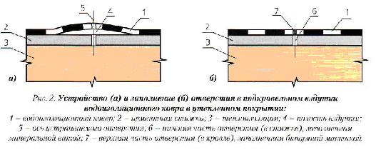 Знание механизма роста вздутий и причин их появления позволило предложить весьма экономичный и надежный метод защиты многослойной кровли от подкровельных, межслойных и внутриосновных вздутий при ее ремонте, заключающийся в устройстве дренажных отверстий, соединяющих полость образовавшегося вздутия с подкровельным пространством в толще утепленного покрытия [1].Эти отверстия пробивают или высвер-ливают с поверхности кровли через всю толщину водоизоляционного ковра и стяжку, после чего нижнюю часть отверстия (под полостью) заполняют воздухопроницаемым материалом (например, минеральной ватой или гранулированным пенополистиролом), а верхнюю герметизируют, как, например, при устранении подкровельного вздутия (рис. 2). При замене или устройстве новой кровли появление подкровельных вздутий можно предотвратить перфорированием выравнивающей стяжки или ее устройством из воздухопроницаемого материала - пенополистиролбетона [2]. Устранение причин появления межслойных, внутриосновных и покровных вздутий предложено осуществлять дополнительной пропиткой стекловолокнистой или картонной основы битумом или битумно-полимерным вяжущим при разогреве ремонтируемых кровель, например с помощью гибких поверхностных электронагревателей.