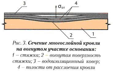 Так, на участках многослойной кровли, основание под которыми имеет вогнутую поверхность, при температурных и усадочных деформациях материалов в водоизо-ляционном ковре возникают достаточно сильные расслаивающие и отслаивающие напряжения (рис. 3). Сдвиговые напряжения, возникающие в многослойной кровле из материалов с разными деформативными свойствами, достигают максимальных значений, когда в смежных слоях водоизоляционного ковра находятся материалы с картонной и стекло-тканевой основой, относительное удлинение которых в водонасыщенном состоянии (а это естественное состояние материалов многослойной кровли) значительно отличается друг от друга. Как показывают испытания на разрыв, в водонасыщенном состоянии кровельный картон (в отличие от стеклово-локнистых материалов), в 4-5 раз лучше растягивается, чем в сухом состоянии. Экспериментальным путем доказано, что эффективной защитой многослойной кровли от расслоений являются: Такой "омолаживающий" состав, проникая в дисперсную структуру битума покровного слоя, способствует уменьшению жесткости содержащихся в нем асфальтенов и восстановлению пластичности битума. Повышение трещиностойкости обработанного эмульсией покровного слоя кровельного материала при воздействии солнечной радиации можно объяснить, во-первых, использованием при приготовлении эмульсии маловязких битумов с повышенным содержанием смол, а значит, более светостойких, чем кровельный, тем более строительный битум, во-вторых, препятствием эмульгатора росту крупных радикалов в высохшем (обезвоженном) слое битумной эмульсии при воздействии на него солнечной радиации.