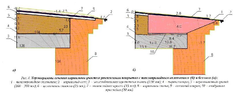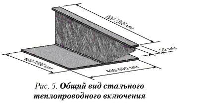 Серьезным испытаниям подвергается многослойная кровля в холодное время года при обледенении карнизных участков кровли, в местах, где под слоем снега из-за нарушения водоотвода скапливается значительное количество талой воды. В Ростовском государственном строительном университете эта проблема исследована на компьютерных моделях. При этом найдено весьма эффективное ее решение, заключающееся в использовании тепла, поступающего в холодное время года из отапливаемых помещений здания для обеспечения положительной температуры карнизного участка кровли за счет кондуктивного теплообмена между более теплыми (нижними) и холодными (верхними) слоями покрытия через устанавливаемые в слое теплоизоляции специально сконструированные теплопроводные включения (рис. 4) из стальных сварных двутавров, нижняя полка которых в несколько раз шире верхней (рис. 5), не требующих затрат на обслуживание и ремонт.