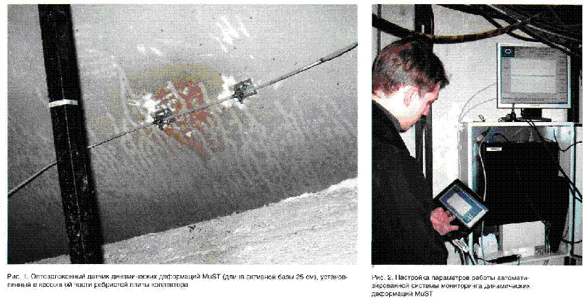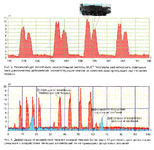 Считывающее устройство комплексной системы мониторинга деформаций и температур (MuST) представляет собой демодулятор брэгговских волн, работающий по принципам микронной оптики. Устройство скомпоновано в герметичном корпусе, не подверженном атмосферным воздействиям и может быть установлено на любой конструкции, требующей проведения непрерывного мониторинга. Считывающее устройство MuST обеспечивает высокую оптическую мощность, скорость измерения до 512 брегговских решеток на 4 каналах. Предназначено для работы с современными перестраиваемыми лазерами, обеспечивающими максимальную скорость сканирования 250 Гц в диапазоне 50 нм. Пользователь может выбрать частоту сканирования от 1 до 250 Гц с фиксированным приращением. Данные передаются на компьютер с установленным программным обеспечением SOFO SDB через стандатрную локальную сеть Ethernet. Удаленное соединение возможно через GPRS модем или скоростную локальную сеть (LAN). Входящие в систему оптоволоконные датчики представляют собой чувствительные оптоволоконные сенсоры, преобразующие механические (статические или динамические) деформации в смещение брэгговской длины волны, которое может быть измерено при помощи считывающих устройств MuST. Датчик состоит из активной и пассивной частей. Активная часть содержит измерительное волокно: между его концами измеряются деформации, ко торые преобразуются в смещение длины брэгговской волны. Пассивная часть не чувствительна к деформациям и используется для соединения датчика со считывающим устройством. В пассивную часть можно установить брэггов-скую решетку в свободном состоянии для измерения температуры и, соответственно, компенсации температурных деформаций. На конструкциях исследуемых тоннелей измерительные датчики устанавливались на поверхность ребер и кессонных частей плит покрытия с использованием специальных крепежных элементов (рис. 1). Считывающее устройство было установлено внутри коллектора. Измерения динамических деформаций с использованием системы MuST проводились в непрерывном режиме (с частотой опроса каждого датчика 250 Гц), начиная с 29 апреля до 15 мая 2008 года. Управление системой производилось дистанционно по беспроводному каналу GPRS (рис. 2). В результате проведенных работ были получены следующие результаты. Во время прохождения тяжелой военной техники в процессе репетиций, а также непосредственно в момент проведения парада над исследуемыми участками коллекторных тоннелей, максимальные динамические деформации, зафиксированные измерительными датчиками системы MuST, составили 19 це (измерительная база датчика 25 см). В то же время разрешающая способность измерительной системы MuST позволила зафиксировать отдельные пики динамических деформаций, соответствующие каждой из колесных осей техники (рис. 3). Также было установлено, что динамические деформации, вызванные нагрузками от военной техники, прошедшей над исследуемыми коллекторами во время репетиций и парада 9 мая, более чем в 12 раз превышают деформации, связанные с воздействием легковых автомобилей (рис. 4) В результате выполненных работ был сделан основной вывод о том, что зафиксированные динамические деформации не являются опасными, с точки зрения эксплуатации, однако приводят к ускорению процессов общего износа конструкций тоннелей и требуют постоянного на