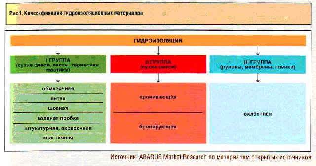 Гидроизоляция в строительстве. Обзор рынкаНа сегодняшний день гидроизоляция представляет собой широкий спектр материалов, способствующих защите зданий и сооружений различного назначения от разрушительного воздействия влаги (омывающей или фильтрующей воды) или другой агрессивной жидкости. Также гидроизоляция создает дополнительное поле защиты от постоянных механических воздействий. Гидроизоляция применяется как при строительстве новых объектов, так и при ремонте сооружений. Гидроизоляция позволяет сохранить водонепроницаемость утеплителя и подкровельных конструкций, герметичность поверхностей наземных и подземных сооружений, объектов промышленного и гражданского строительства, гидротехнических объектов, в т.ч. находящихся под постоянным давлением воды, обеспечивая, т.о., нормальную эксплуатацию зданий, сооружений и оборудования, повышает их надежность и долговечность. В общем смысле гидроизоляция - это комплекс мер по защите сооружения от воздействия влаги и воды. По принципу действия гидроизоляционные материалы делятся на три основные группы: 1. Обмазочные. 2. Проникающего действия. 3. Оклеечные (мембранные, рулонные). Гидроизолирующие материалы давно широко применяются в России в промышленном строительстве и строительстве гидросооружений. Что касается гидроизоляции жилых зданий, то этот сегмент стал активно развиваться относительно недавно (около 10 лет), сначала в крупных городах, а затем и в регионах, особенно тех, где в связи с особенностями климата существует необходимость в гидроизоляции, как минимум, фундаментов зданий, а также стен и кровли. Гидроизоляция кровли необходима в том случае, если кровельное покрытие не обеспечивает достаточной влагонепроницаемости. Например, мягкая кровельная черепица сама по себе создает влагонепроницаемый барьер при достаточно большом угле наклона крыши, и дополнительная гидроизоляция в этом случае требуется только на карнизах. Но в случае использования еврошифера, металлочерепицы, натуральной черепицы и некоторых других кровельных покрытий гидроизоляция кровли обязательна по всей поверхности. Помимо общей классификации, приведенной на рис.1., гидроизоляционные материалы группируются также, по дополнительным свойствам. Опираясь на данные журнала "Ремонт.Услуги.Материалы", можно выделить антифильтрационную и антикоррозионную (она же - электрокоррозионная) гидроизоляции. По виду основного материала различают гидроизоляцию асфальтовую, минеральную, пластмассовую и металлическую. По способу устройства и ведения работ -окрасочную, штукатурную, оклеечную, литую, пропиточную, инъекционную, засыпную, монтируемую. По основному назначению и конструктивным особенностям -поверхностную, шпоночную, работающую "на прижим" и "на отрыв", уплотняющую швы и сопряжения, комплексного назначения (теплогидроизоляция, пластичные компенсаторы). Окрасочную гидроизоляцию (горячую и холодную) выполняют в виде тонкого (до 2 мм) многослойного покрытия, обычно из битумных и полимерных лаков и красок, для противокапиллярной и антикоррозионной защиты железобетонных и металлических конструкций. Наиболее надежны горячие битумно-полимерные и холодные эпоксидно-каучуковые покрытия. Все большее применение получают новые полимерные материалы холодного отверждения. Штукатурная гидроиз
