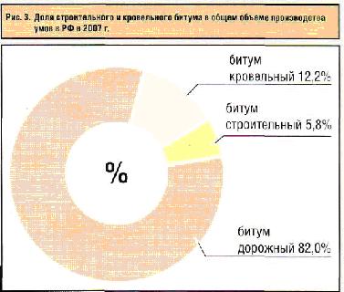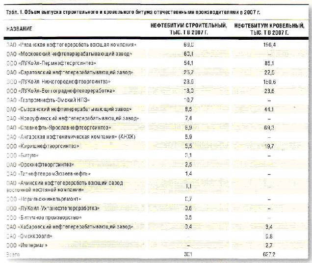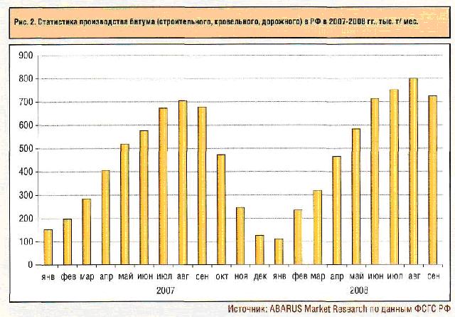 Битум получают окислением остаточных продуктов прямой перегонки нефти и их смесей с асфальтами и экстрактами масляного производства. В связи с различными климатическими условиями на территории России, строительный битум подразделяют на две основные марки: 70/30 - предназначенный для мягких климатических условий и 90/10 -для регионов с умеренным и холодным климатом. Объемы выпуска битума в России стабильны, основной пик производства и использования приходится на июнь-сентябрь. В общем объеме битума, производимого в стране, превалирует битум для дорожного строительства - более 80%. Одним из факторов постоянного роста популярности строительного битума является дешевизна этого вида гидроизоляции. Основные направления использования битума - ремонт кровли и битумная гидроизоляция фундаментов - обуславливают потребность этого материала в больших объемах, что, в свою очередь, ведет за собой крупные закупки. Средняя цена битума - 12-15 руб. за кг. Битум выпускают как простой, так и в виде мастик и праймеров, которые стоят 18-19 руб. за кг. Производители - "ЛУКойл" ("Пермнефте-оргсинтез", "Волгограднефтепереработка"), Омский НПЗ, ОАО АНХК и др.