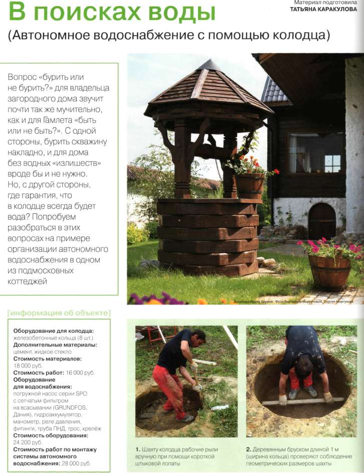Если в районе участка есть подземные межпластовые воды, оптимальным может оказаться сооружение колодца. На объекте, о котором мы хотим рассказать, хозяин дома, взвесив все «за» и «против», отказался от скважины в пользу колодца. В первую очередь он руководствовался соображениями экономического характера, ведь устройство, а тем более последующая эксплуатация колодца обходится намного дешевле скважины. Но были и другие причины. Напротив дома в 50 м находится колодец общего пользования, который исправно снабжает водой жителей деревни уже на протяжении 50 лет и не пересыхает даже в самое жаркое время. Владелец коттеджа рассудил, что, возможно, удастся попасть в ту же водоносную жилу. Ну и ещё одна причина — небольшой состав семьи. Для трёх человек дебита колодца предположительно должно было хватить. Подсчёты велись следующим образом. В доме будет 8 точек водопотребления (2 умывальника, 2 унитаза, ванна, кухонная мойка, стиральная и посудомоечная машины). Из открытого водопроводного крана при трубе 1/2" вытекает 0,2-0,4 м3 в час. Расход воды в пиковый период (при одновременном включении всех точек во-доразбора) составляет 1,2-1,5 м3/ч. Но на практике, как правило, никто не пользуется сразу всеми кранами, стиральной и посудомоечной машинами. Суточная же потребность — не более 2-3 м3. Поскольку колодец может дать до 3 м3 воды в сутки (то есть дебит колодца — 0,12 м3/ч), хозяин дома и остановил свой выбор на этом типе водного источника.
