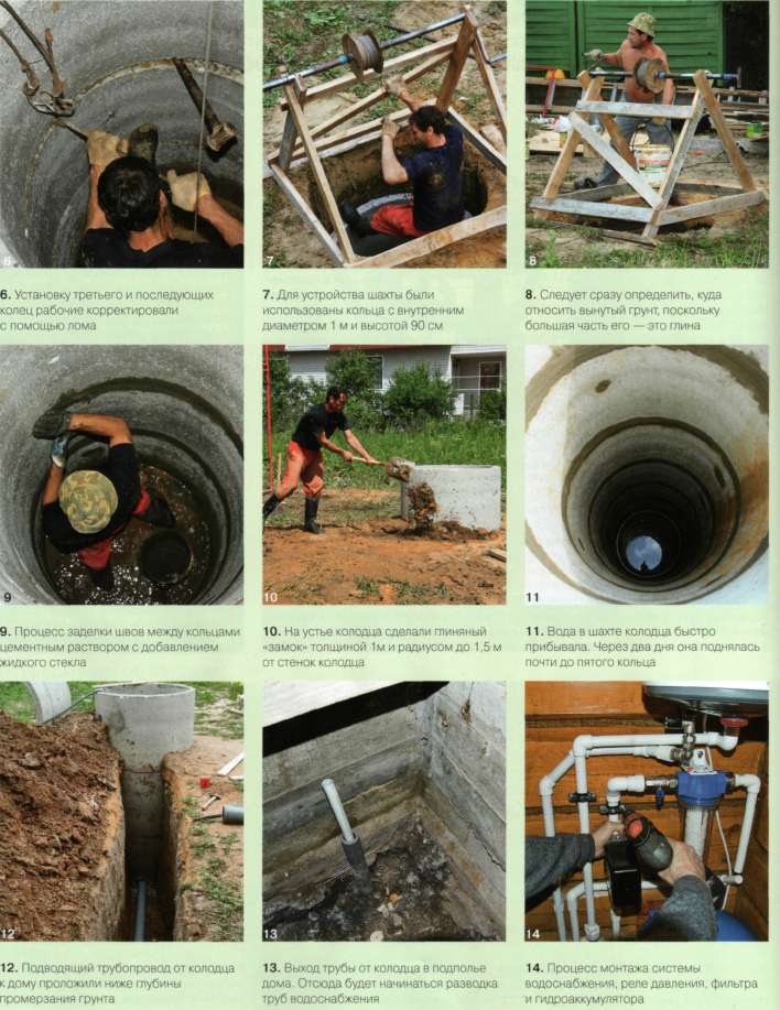 Всего в шахту уложили семь колец, а восьмое, установленное на поверхности, стало оголовком колодца. (Оголовок должен выступать над землёй на 0,7-0,8 м.) Технологические отверстия и швы между кольцами аккуратно и надёжно загерметизировали. В стенке колодца, ниже глубины промерзания, сделали отверстие, в которое вставили резиновую муфту и через неё проложили пластиковую трубу диаметром 100 мм в дом. Впоследствии через неё будет выходить подающий патрубок от насоса. На устье колодца устроили глиняный «замок» в виде кольца высотой 1 м от земли и шириной до 1,5 м от стенок колодца. Поверхность «замка» выполнили с уклоном от колодца.
