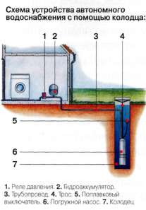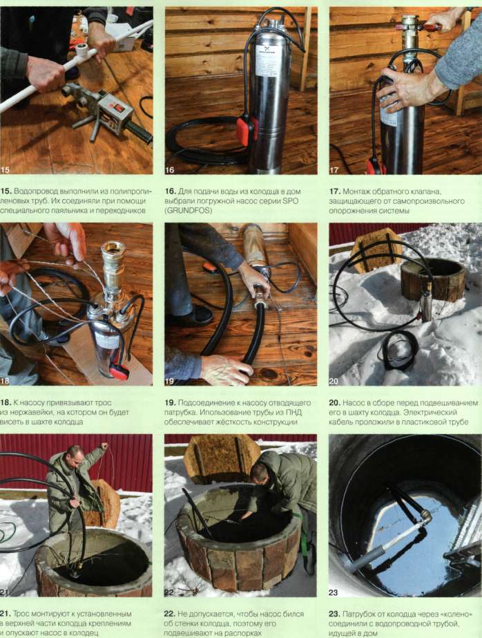 Чтобы организовать систему водоснабжения на его основе, необходимо приобрести и установить напорный бак (гидроаккумулятор), предохраняющий насос от частых включений и защищающий водопровод от резких гидравлических ударов; реле давления для автоматизации работы оборудования; обратный клапан для предотвращения само-произвольного опорожнения системы при остановке насоса и т. д. Установив крепления в верхней части колодца, на них повесили трос, к которому привязали насос. Его опустили в колодец таким образом, чтобы всасывающий патрубок отстоял от дна шахты на 1 м. Подающий патрубок от насоса протянули через предварительно уложенный под землёй трубопровод в дом. После этого в помещении санузла установили все необходимые «аксессуары» к насосу и смонтировали водопровод из полипропиленовых труб. Подключили сантехприборы и вывели канализационный слив в подготовленную заранее систему глубокой биологической очистки стоков. На этом монтаж автономного водопровода в коттедже был завершён. Тест пробы воды показал её соответствие санитарно-гигиеническим требованиям.