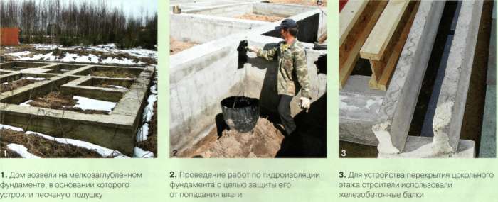 Земляные работы строители производили вручную. Расчётная глубина траншей составила 0,6 м, ширина — 0,4 м. Основанием фундамента стала проти-вопучинная песчаная подушка высотой 0,2 м. На основание настелили полимерную плёнку, чтобы цементное молочко из бетона не уходило в песок. Установили щитовую опалубку и смонтировали арматурный каркас. Подачу бетона (марки М300) в опалубку осуществляли бетононасосом. Для уплотнения смеси использовали глубинный вибратор. После заливки фундамент накрыли плёнкой, чтобы исключить образование микротрещин при высыхании поверхностного слоя бетона.