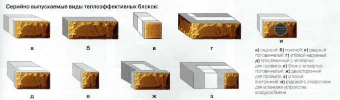 При возведении зданий используют несколько теплоэффективных видов блоков: рядовые (в том числе элемент с отверстием для воздушного клапана вентиляции дома), угловые, с четвертью для проёмов, поясные, доборные.