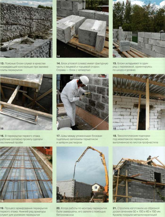 После возведения стен первого этажа и укладки по периметру поясных блоков (в них отсутствует несущая часть) рабочие приступили к устройству перекрытия первого этажа. Его выполнили из листов оцинкованного профнастила толщиной 0,55 мм, уложенных на технологические подпорки, изготовленные из деревянных брусков. Листы профнастила клали с нахлёстом 10 см. Поверх них, на специальные пластмассовые компенсаторы, обеспечивающие равномерное распределение прутьев арматуры в теле перекрытия, положили прутья стальной арматуры диаметром 16 мм с шагом 200 мм. Нижний ряд арматуры усиливает перекрытие и помогает ему справляться с нагрузкой на растяжение. Согласно проекту, сверху уложили готовую сетку с ячейкой 100 х 100 мм из стержней арматуры диаметром 6 мм. После этого с помощью бетононасоса залили перекрытие, толщина которого составила 12 см. Впоследствии плиту снизу подшили гипсокар-тоном, создав таким образом потолок первого этажа. Через семь дней бетон набрал 70% прочности, и по перекрытию можно было передвигаться и продолжать возводить стены здания. Внутренние несущие стены и перегородки (с целью экономии средств) выложили из газосиликатных блоков.