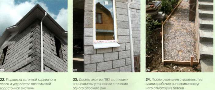 Уложили кровельный «пирог» и покрыли крышу металлочерепицей. Архитектурную выразительность дому придают выступающие поясные блоки, блоки для окон и угловые элементы. В зависимости от проекта они могут быть окрашены в цвет, отличный от рядовых стеновых блоков.