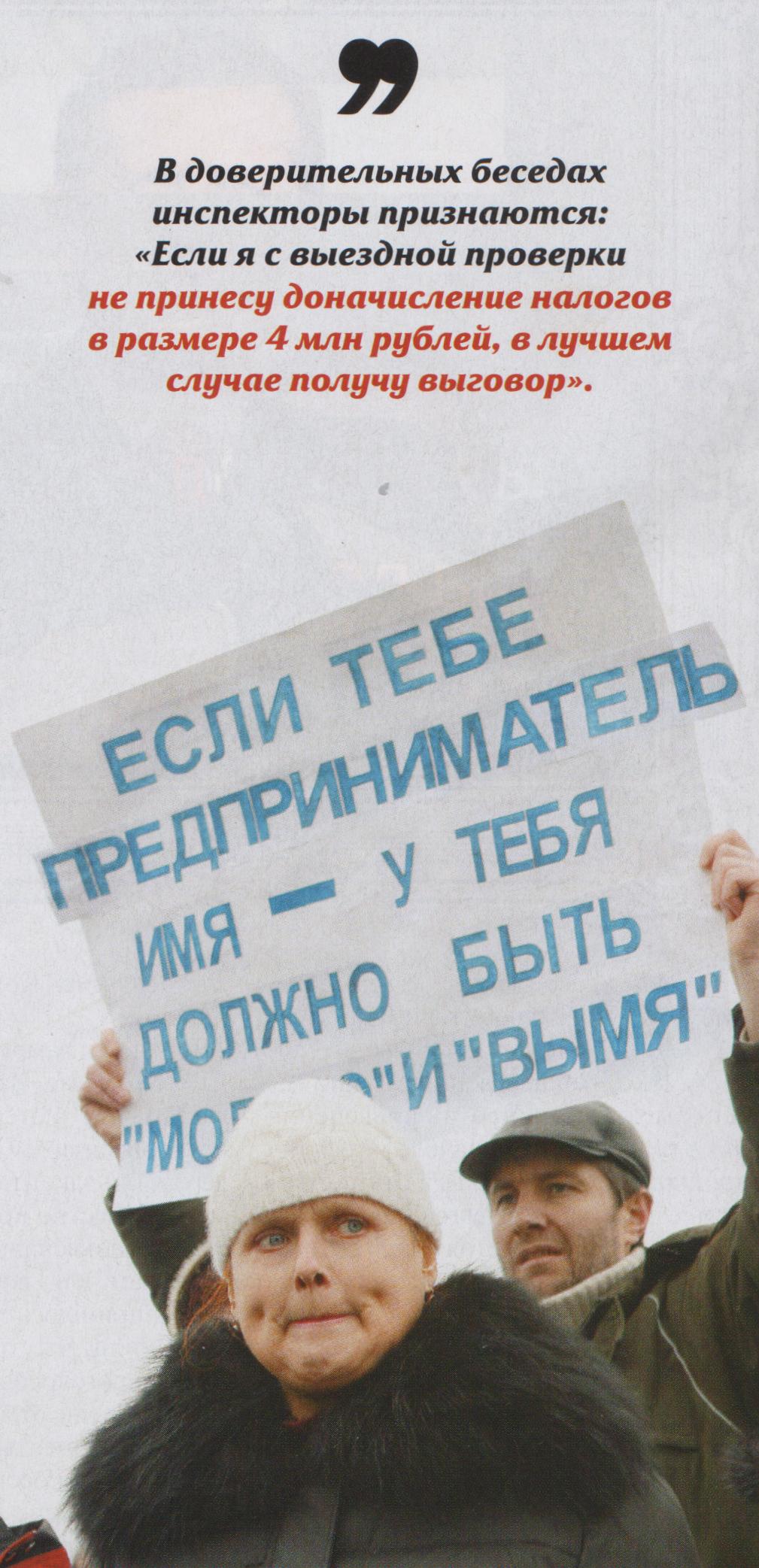 — Сегодня происходит примерно так. Подает налогоплательщик налоговую декларацию и просьбу о возмещении налогов. И если инспектор признает, что все документы в порядке и выносит решение о возмещении, у него в дверях может появиться прокурор, который обвинит его в сговоре с налогоплательщиком. А если инспектор напишет, что документы в порядке, но физиономия налогопла-тельщикаемуненравитсяи поэтому он отказывает ему в воз-мещении средств из бюджета, то это решение просто отменит суд через полгода, с инспектора за это никто не спросит. Вот таким и методами обеспечиваются фискальные интересы бюджета. Инспекторы в подавляющем большинстве своем нормальные люди. В доверительной беседе они говорят: «Мы вынуждены так делать. Всей душой я понимаю, что вы правы. Но если я с выездной проверки не принесу доначисление налогов в размере 4 млн рублей, в лучшем случае получу выговор». В худшем случае, как я уже