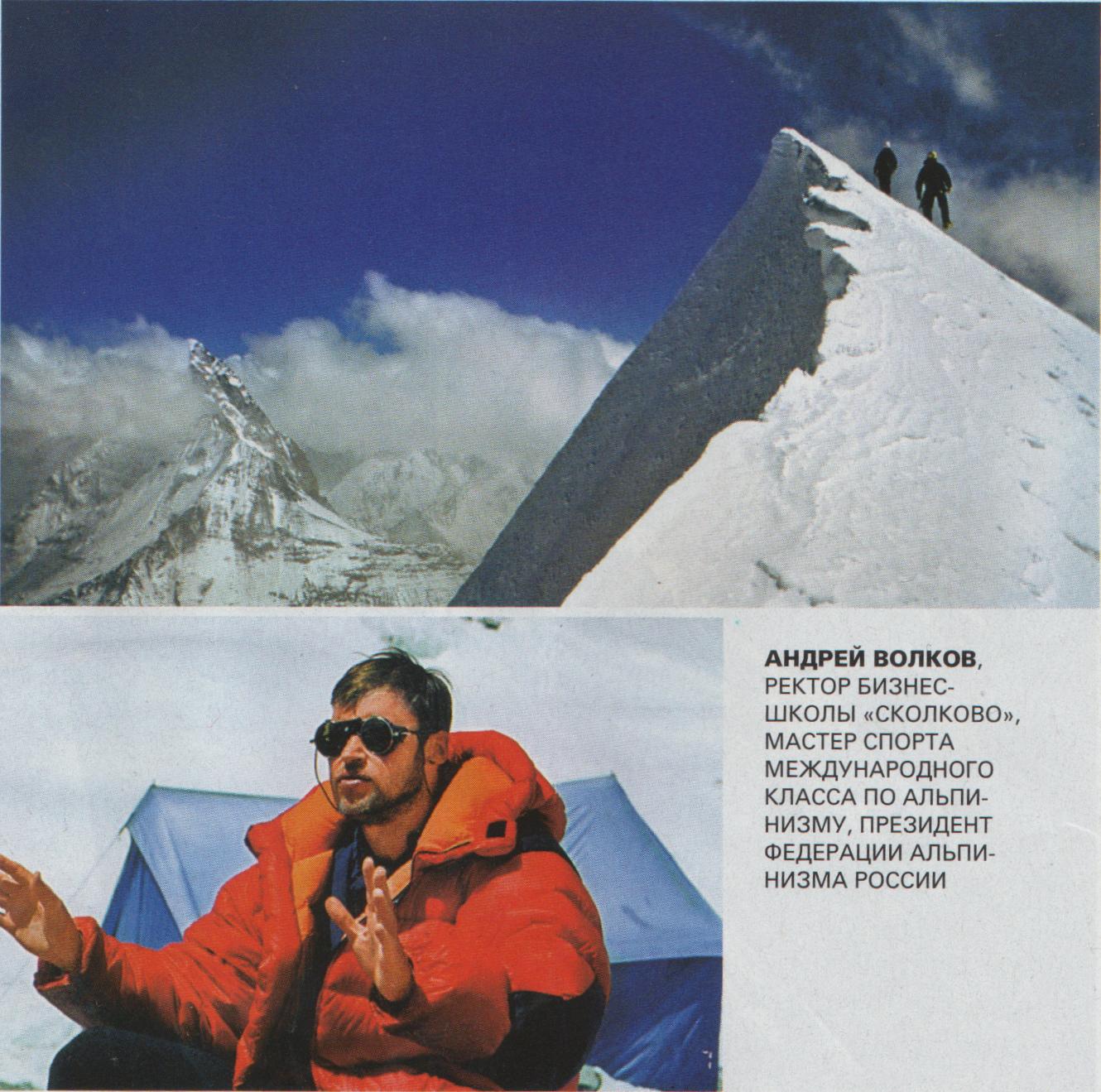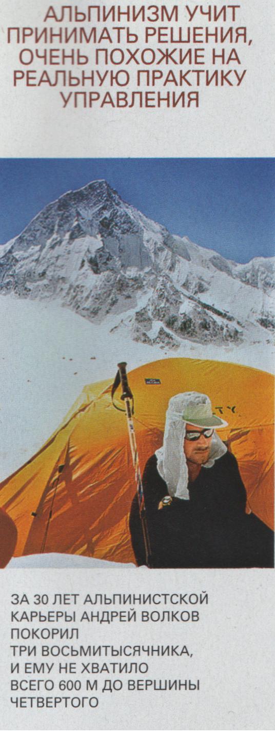 ГОРНЫЙ ИНСТИТУТЧерез год после К-2, в 1997 году, мы пошли на Нанга-Парбат (8125 м) в Кашмирских Гималаях. Я даже не смог приехать вместе со всеми на экспедицию, уже тогда у меня было много обязанностей на работе, я ехал отдельно, добирался через Пакистан. Из Исламабада надо ехать три дня на джипе по Каракорум-хайвэй — это знаменитая, очень страшная дорога, которая соединяет через горы Китай и Пакистан. Всем любителям автомобильных приключений рекомендую когда-нибудь по ней проехать. Там нет бордюров, она вырублена в скале и нависает над пропастью.В Нанга-Папбат мы чуть не погибли от лавины. Я проснулся ночью от ощущения, будто меня... заливают в бетон — шла мокрая лавина, медленно, со скоростью 100 м/с, но этого было достаточно, чтобы закопать нас. Мы оказались на глубине полметра в абсолютном склепе: темно, воздуха нет. К счастью, Виктор, мой товарищ, сумел выбраться сам и откопал меня. На следующий день мы шли по тому склону, где прошла лавина. Если бы мы ошиблись и встали не в том месте, у нас бы не было ни единого шанса выжить. Вот это самое важное в альпинизме. Приходится постоянно обо всем думать, все контролировать, как на военном корабле, где 15 экранов и тебе надо на все смотреть. Или будто одновременно жонглируешь восемью шариками. Пока шарики не падают, ты живой. Поэтому я утверждаю, что альпинизм — очень интеллектуальное занятие и особенно помог мне в научной и бизнес-карьере. Альпинизм прежде всего требует головы, а потом рук, ног, выносливости. Он учит принимать решения, очень похожие на реальную практику управления. Здесь надо уметь ставить четкие цели, выбирая из огромного множества доступных, а потом в коммуникации с другими людьми уметь договориться. Но о чем бы вы ни договорились, все поменяется, и надо быть к этому готовым и оперативно отреагировать. Вы всегда работаете в условиях неопределенности. Перед походом, как и в реальном бизнесе, надо подготовить ресурсное обеспечение — от правильной палатки может зависеть не просто комфорт, но и ваша жизнь. Если ее порвет ветром на пяти-, семитысячнике, шансы выжить у вас невелики. А после восхождения у нас всегда шла важная процедура разбора: мы анализировали поход. Вот что стоило бы делать после каждой сделки! Но если в бизнесе можно выйти из сделки и прийти в сделку, то там уйти некуда.