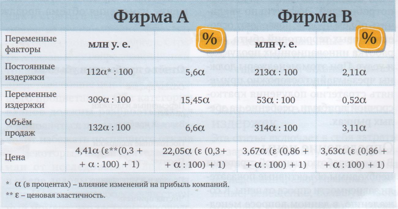 Однако увеличение ценовой эластичности спроса и превращение многих продуктов в стандартизованные товары - закономерность нашего времени. Специалисты пытаются найти решение проблемы оптимизации цен в зависимости от эластичности и издержек. Разработаны методы и программы, позволяющие следить за изменением прибыли и нормами рентабельности в зависимости от ситуации на рынке или мероприятий, проводимых компанией. Цена - элемент маркетинга-микс, который приносит компании непосредственный доход. В краткосрочной перспективе изменение цен влияет на показатели прибыли гораздо сильнее, чем коррективы, которые вносятся в рекламу или другие составляющие маркетинга. Кроме того, цена - очень гибкий и тонкий инструмент, позволяющий быстро реагировать на происходящее в бизнесе. Динамизм современных рынков требует постоянного совершенствования не только методов, но и стратегий ценообразования. К сожалению, редкие компании грамотно работают над этими проблемами. Большинство фирм не придают значения оперативному сбору и обработке информации, полагаясь на своё понимание бизнеса. Многие менеджеры не уделяют этому вопросу того внимания, которое он заслуживает, считая, что цена определяется рынком, а значит, находится вне контроля. Значение любых ценовых решений возрастает с увеличением числа рыночных сегментов с чувствительностью к цене и усилением конкуренции. Поэтому цены должны быть настолько гибкими, чтобы компания могла использовать конкурентные преимущества своего товара. В предложенном методе анализируются возможности оптимизации цен в зависимости от эластичности кривой спроса и от структуры издержек. Его применение позволит периодически корректировать цены с учётом новых рыночных условий для получения наибольшей экономической прибыли. Кроме того, стратегия относительно быстрого повышения цен требует проведения тренингов для торговых агентов компании, поскольку продавцы ориентируются на объём продаж, а не на прибыль. Рассмотрим применение этого подхода и связанные с ним ограничения на примере двух фирм - А и В. Первая производит химикаты промышленного назначения. Проблемы у компании начались после того, как не удалось адаптироваться к изменениям рыночной среды, что привело к уменьшению доли в сегменте и прибыли. Анализ развития сферы медицинских услуг, где работает фирма В, позволяет её менеджерам предсказать снижение объёмов продаж в ближайшее время. Проблема, с которой столкнулась вторая компания, весьма серьёзна. Поскольку кризис компаний А и В в наибольшей степени отражается на показателе прибыли от продажи, то мы рассмотрим возможности его повышения. В таблицах 1 и 2 представлен отчёт о прибылях и убытках фирм А и В. Достаточно бегло взглянуть на итоговую таблицу з, чтобы убедиться в огромных возможностях предприятий при работе менеджеров над повышением показателя прибыли от продажи. Таблица помогает оценить увеличение прибыли за счёт вариации переменных факторов (для этого нужно подставить вместо а процентов любое значение, соответствующее величине их уменьшения или увеличения).