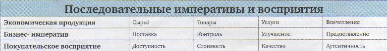 Аутентичность становится первоисточником дифференциации стандартизованных товаров и услуг. Чтобы преуспеть, менеджеры добавляют к своему опыту в управлении цепочкой поставок, снижению затрат и улучшению качества понимание того, что клиент считает настоящим, а что - фальшивым в коммерческих предложениях или, по крайней мере, какие элементы влияют на его мнение. В таблице показано, как развитие потребительского восприятия влияет на бизнес-императивы.