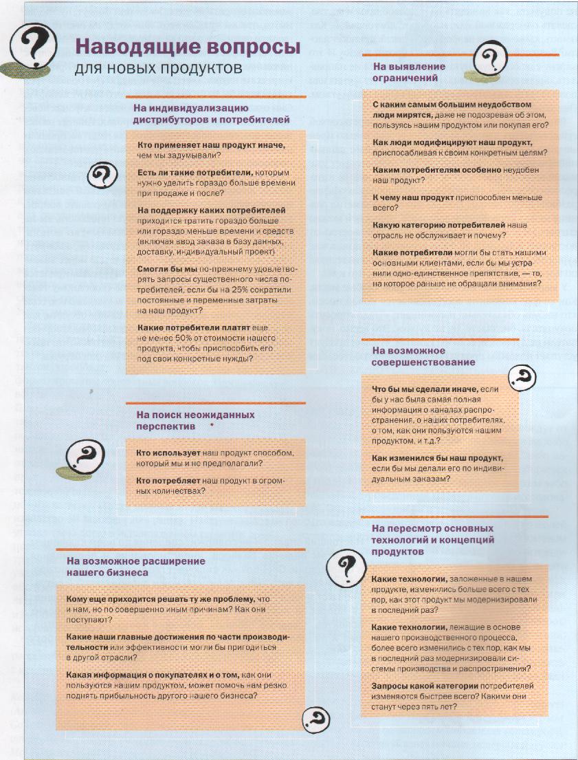 Правильно задавайте вопросыДесять лет назад наша группа из McKinsey узнала об исследованиях Михая Чиксентмихайи, в то время профессора психологии Чикагского университета. Он проводил подробные интервью с людьми, которые внесли большой вклад в науку, искусство, бизнес и т.д., в частности, с нобелевскими лауреатами. Из его материалов следовал интересный вывод. Как только эти люди задавали себе правильные вопросы, они делали одно открытие за другим. Это навело нас на мысль: изучить, каким образом выбились в лидеры самые сильные компании последнего времени. Мы выбрали организации двух типов: изначально крупные компании, которые довольно быстро вышли на первые позиции в своих отраслях, и те, что начинали практически с нуля, но менее чем за шесть лет встали на ноги (объем продаж достиг не менее $ 1 млрд). В обоих случаях успех им обеспечили новаторские идеи, которые изменили ассортимент продуктов и услуг на их рынках.Оказалось, многие из этих инноваций появились в ответ на конкретные вопросы. Но, как мы поняли, не имеет значения, был ли задан вопрос, который открывал новые перспективы. Важно, что он «носился в воздухе». CNN, Google, USA Today, eBay, Amazon такие перспективы выявили и воспользовались этим. Мы отобрали 50 идей, осуществивших переворот в разных отраслях, и, произведя «обратную отмотку», докопались до тех вопросов, которые могли навести на них любого умного руководителя. Часть вопросов была напрямую связана с определенными отраслями, но мы нашли и применимые абсолютно ко всему (см. врезку «Наводящие вопросы для новых продуктов»). Один из универсальных вопросов звучит примерно так: «С каким самым большим неудобством люди мирятся, даже не подозревая об этом, пользуясь нашим продуктом или покупая его?» Предприниматели, которые задались целью устранить подобные неудобства, придумали Jiffy Lube (станции техобслуживания, где, в частности, можно срочно сменить масло), СагМах (сеть автосалонов, где можно купить подержанную машину с гарантией, по фиксированной цене) и даже столь нехитрый товар, как небольшая упаковка поленьев (для тех, у кого нет места для настоящей поленницы). Такого рода возможностей в мире еще полным-полно. Взять хотя бы розничную торговлю бензином. Какое тут самое существенное «неочевидное» неудобство? Надо ехать на заправку. Обычный автомобиль находится в дороге лишь около 500 часов в год, остальные 95% времени где-нибудь стоит, чаще всего на крупных автостоянках. Что если на такие стоянки приедет небольшая цистерна с бензином и заправит автомобили, на которых владельцы оставили флажок: «Пожалуйста, заправьте эту машину»? Спросите ради интереса любого водителя, который в холод и дождь возится с «пистолетом» на автозаправке, как ему такая идея. Естественно, на один и тот же вопрос бывает много ответов. Посмотрим, что нового могли бы придумать разные подразделения банка, если бы им задали вопрос: «Какой категории потребителей особенно трудно приобрести наш продукт?» Отдел ссуд наверняка сразу бы ответил, что малым предприятиям: для оформления кредитов обеим сторонам нужно подготовить несоразмерное занимаемым суммам количество документов. Банк мог бы создать, например, что-то вроде ломбардов, в которые малые предприятия закладывали бы свои активы в качестве гарантии возвращения ссуды. Тем самым необходимость в большинстве документов от