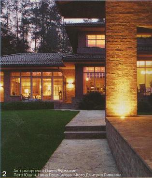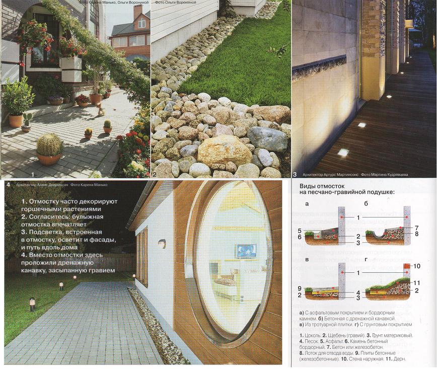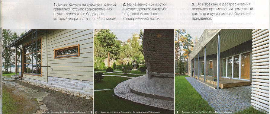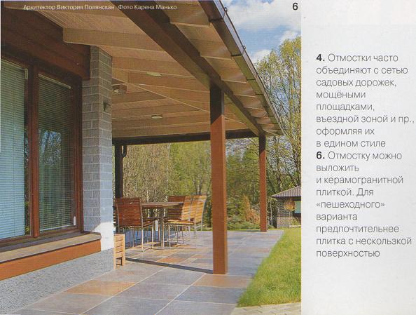 Отмостку с полным основанием можно назвать элементом «двойного подчинения», поскольку она одновременно связана и с архитектурным обликом дома, и с оформлением сада. К тому же роль её часто не ограничивается отводом воды от фундамента. При достаточно большой ширине (от 1,2 м) она прекрасно справится с пешеходной функцией, превратившись в опоясывающую дом дорожку. Расширяясь местами, мощёная отмостка может образовать площадки для садовой мебели и растений в контейнерах, плавно влиться в патио, въездную зону, перетечь в садовые дорожки и лестницы. Варьируя элементы мощения, на ней выделяют разные по назначению зоны, места проходов и пр. Нередко в тело отмостки врезают небольшие цветники, рокарии, другие растительные композиции. Для подобных игр больше подходят твёрдые отмостки ^тому же облагораживать неприглядную поверхность бетона всё равно придётся. Многие виды мощения годятся и для мягких отмосток, которые тяготеют к натуральным материалам (галька, гравий, дощатые настилы и пр.). Ими также можно воспользоваться, чтобы приблизить к самым стенам дома газоны и цветники.