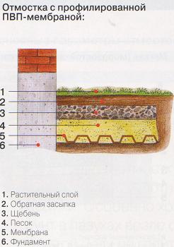 Мягко стелемОшибки и нерадивость строителей нередко вынуждают хозяев дома латать бетонную отмостку каждый год. Это стимулирует поиски альтернативы бетону. В качестве таковой, например, используют профилированные ПВП-мембраны, которые прекрасно справляются с ролью гидроизоляции, не покрываются трещинами и к тому же просты в работе. Мембрану помещают на грунт, под слой песка и щебня, а покрытие может быть любым, вплоть до газонной травы — надо только насыпать поверх щебня слой плодородной почвы толщиной хотя бы 20-30 см. Некоторые же предлагают в загородном домостроении полностью перейти на мягкие морозостойкие отмостки, не боящиеся сезонных подвижек грунта. Единственное условие, необходимое для их нормальной службы, — эффективный сбор и отвод воды как с крыши, так и с самой отмостки. Но об этом чуть позже.