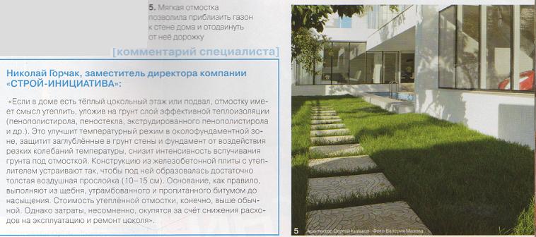 Несколько слов о гидроизоляции мягкой отмостки. Выбирая её, прежде всего стоит обратить внимание на долговечность и морозостойкость. В этом смысле полиэтиленовая плёнка или рубероид и подобные ему битумные материалы не могут конкурировать с материалами на основе полипропилена (тектон и пр.). Прекрасно работают в отмостке и ПВХ-плёнки, используемые при строительстве искусственных водоёмов. Под гидроизоляцией неплохо бы проложить утеплитель, который не даст земле промёрзнуть. Это особенно актуально, если в доме есть отапливаемый цокольный этаж. Наши соседи финны, вообще не признающие твёрдых отмосток, укладывают теплоизоляцию под финишный слой. [основные параметры отмосток]
