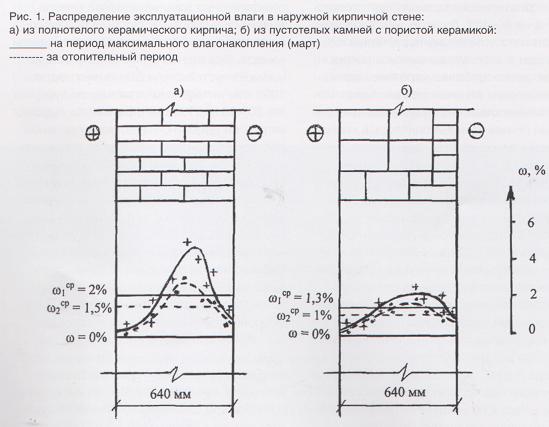 По этим причинам, на основании результатов натурных и лабораторных исследований, расчетное (нормативное)значение эксплуатационной влажности кирпичной кладки из плотного кирпича для условий эксплуатации Б принято равным 2%, существенно превышающим максимальное значение сорбционной влажности керамики, равной 1%. Для цементно-известково-песчаного раствора нормативное значение влажности для условий эксплуатации Б принято равным 4%. Оно несколько ниже максимального сорбционного значения, равного 5-6%. Часть влаги из раствора передается примыкающей керамике. Особенно это заметно в кладке из пустотелого кирпича, имеющего более развитую наружную поверхность, соприкасающуюся с влажным раствором, почти в два раза превышающую площадь полнотелого. Да и раствора в кладке из пустотелого кирпича на 30-40% больше, чем в кладке из полнотелого. Поэтому пустотелый кирпич входит в эксплуатационное влажностное состояние за более короткие сроки.