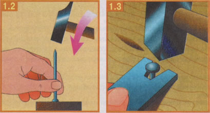 Забивая мелкие гвоздики, держать их лучше не пальцами, а с помощью небольшого кусочка картона с прорезью (рис. 1.3). Можно использовать для удержания гвоздиков и обычную расческу. И в том, и в другом случае пальцы не пострадают от молотка. Шляпки забитых гвоздей, которые оказываются на лицевой стороне, обычно рекомендуют слегка утопить, а оставшиеся после этой операции лунки зашпаклевать (рис. 1.4).