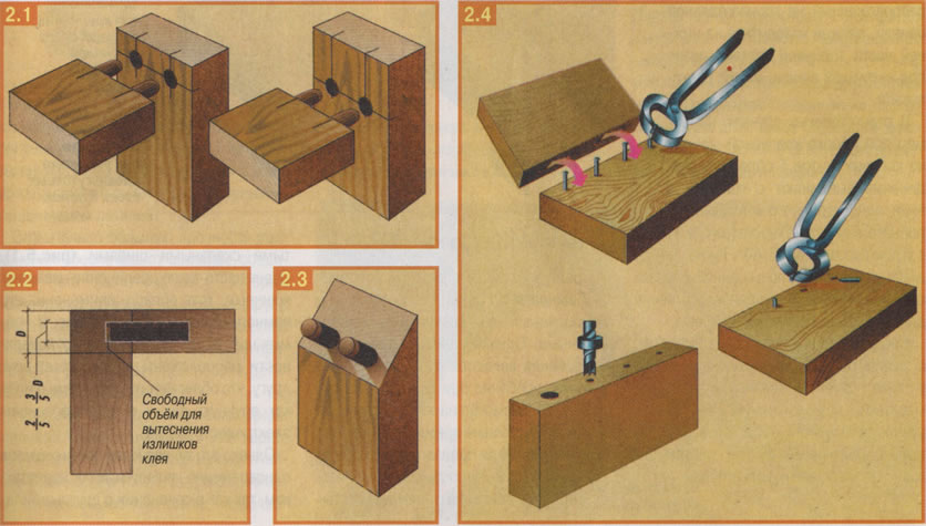2.1 Выполнить соединения на круглых шкантах сравнительно просто. Однако отверстия под них следует сверлить как можно точнее.