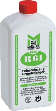 HMK R61СВОЙСТВА: HMK R61 - это специальное чистящее средство (концентрат). Оно удаляет маслянистые и жирные пятна, старые остатки средства по уходу, строительную грязь и легкий цементный налет с керамогранита с полированной, шлифованной или термообработанной поверхностью во внутренних и внешних областях. Полированные поверхности не повреждаются. ПРИМЕНЕНИЕ: Отключить панельное отопление в полу. На остывшую поверхность наносится R 61, разводится с водой в зависимости от загрязнения (от 1:2 до 1:10), с помощью швабры, щетки или другим удобным способом. Оставить нанесенное средство на 10 минут (не давая высохнуть), еще раз основательно обработать и снять загрязненный слой. Затем обильно промыть поверхность чистой водой. При очень сильном загрязнении повторить процесс чистки. При использовании моющих машин мы рекомендуем применять противопенное средство HMK Z102. Проверить на образцовой поверхности, чтобы установить пригодность и расход. Температура обработки должна составлять от +12 до +25°C Важно: Полированный мрамор и известняк, алюминий, пластмассы, протравленная или натертая воском древесина и лакированные поверхности не обрабатывать. Капли сразу вытирают и промывают чистой водой. |