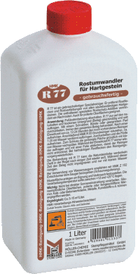 HMK R77СВОЙСТВА: HMK R77 - это готовое к употреблению специальное чистящее средство. Оно удаляет пятна и выступы ржавчины на всех кислотостойких жестких породах камня. Специальные добавки защищают от коррозии и уменьшают дальнейшее образование ржавчины. Также подходит для полированных поверхностей. ПРИМЕНЕНИЕ: Отключить панельное отопление в полу. Применять R77 необходимо исключительно на остывшей и сухой поверхности. Средство наносится обильно и равномерно с помощью швабры, щетки или другим удобным способом. Обрабатывать всю площадь покрытия. После времени действия, примерно 12-24 ч., применяют оставшиеся чистящее средство. Затем наносится HMK R55 (основное чистящее средство не содержащие кислоты), разбавленное примерно 1:20 с водой, основательно очищается поверхность и убирается загрязнение. В конце поверхность обильно смывают чистой водой. Во время действия HMK R77 средство периодически наносится и закрывается пленкой, чтобы чистящее средство не высыхало. При сильных пятнах ржавчины процесс чистки повторяется. Обратите внимание, что HMK R77 может затемнить цвет природного камня (цвет возвращается снова, как правило, через некоторое время). В течение времени действия средства поверхность не обрабатывается пропитывающими средствами и чистой водой. При использовании моющих машин мы рекомендуем применять противопенное средство HMK Z102. Проверить на образцовой поверхности, чтобы установить пригодность и расход. Температура обработки должна составлять от +12 до +25°CВАЖНО: Не применять при попадании прямых солнечных лучей. Восприимчивые к кислоте поверхности, полированный или шлифованный мрамор, известняк, металлы, пластмассы могут быть повреждены. » Беречь от детей. » Соблюдайте НМК-рекомендации по обработке! |