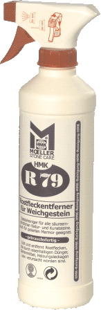 HMK R79СВОЙСТВА: HMK R79 - это готовое к употреблению специальное чистящее средство. Он удаляет ржавчину и пятна окисленного металла на всех поверхностях природных камней и мрамора, которые были вызваны, например железосодержащим удобрением, садовой мебелью и т.д. Добавленные специальные добавки защиты от коррозии уменьшают процесс образования ржавчины. Также предназначен для полированного мрамора и известняка. ПРИМЕНЕНИЕ: Средство HMK R79 равномерно и обильно распыляется исключительно на остывшую (при панельном отоплении пола) и сухую поверхность. После времени действия средства (приблизительно 10-15 минут) средство наносится еще раз. Затем наносится HMK R55 (основное чистящее средство, без содержания кислоты), разбавленное, примерно 1:20, с водой и основательно очищается поверхность от остатков средства и грязи с помощью швабры, щетки или другим удобным для Вас способом. В конце чистки поверхность обильно промывается чистой водой. При сильных и старых пятнах ржавчины повторяют процесс чистки вплоть до полного удаления загрязнения. HMK R79 не должен высыхать при обработке. После использования, распылитель отвинчивают и прополаскивают с водой. Проверить на образцовой поверхности, чтобы установить пригодность и расход. Температура обработки должна составлять от +12 до +25°CВАЖНО: Не обрабатывать под прямым попаданием солнечных лучей. Не обрабатывать пластмассы, пропитанное и парафинированное дерево, лакированные поверхности. Распылитель сразу же протереть и промыть чистой водой. » Беречь от детей. » Соблюдайте НМК-рекомендации по обработке! |